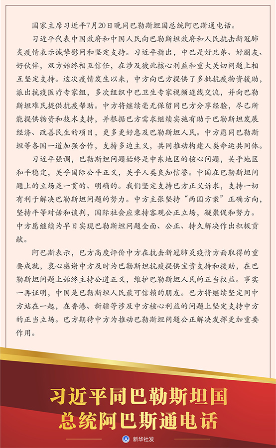新華社北京7月20日電 國(guó)家主席習(xí)近平7月20日晚同巴勒斯坦國(guó)總統(tǒng)阿巴斯通電話。