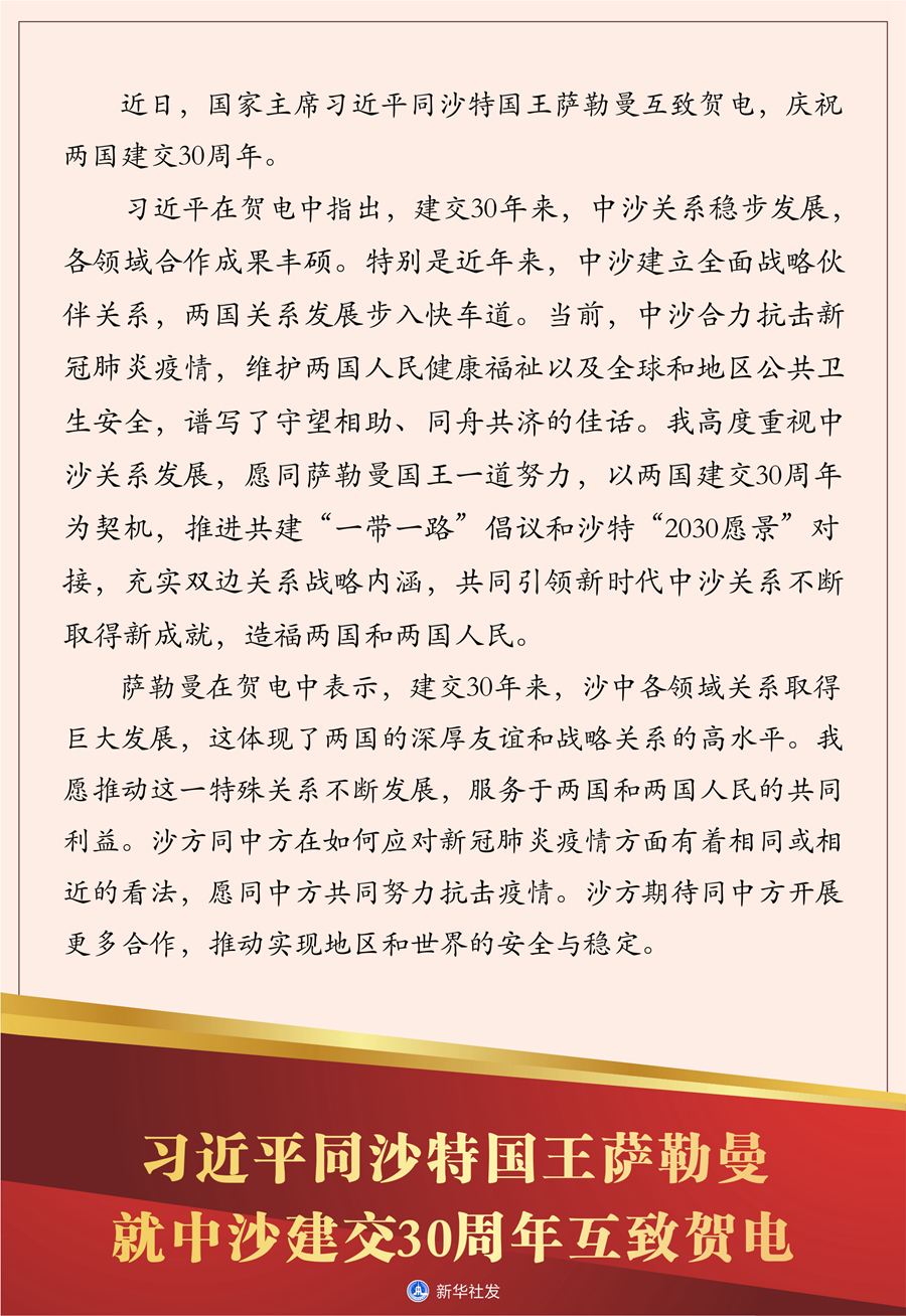 習(xí)近平在賀電中指出,建交30年來,中沙關(guān)系穩(wěn)步發(fā)展,各領(lǐng)域合作成果豐碩。特別是近年來,中沙建立全面戰(zhàn)略伙伴關(guān)系,兩國關(guān)系發(fā)展步入快車道。當(dāng)前,中沙合力抗擊新冠肺炎疫情,維護(hù)兩國人民健康福祉以及全球和地區(qū)公共衛(wèi)生安全,譜寫了守望相助、同舟共濟(jì)的佳話。我高度重視中沙關(guān)系發(fā)展,愿同薩勒曼國王一道努力,以兩國建交30周年為契機(jī),推進(jìn)共建“一帶一路”倡議和沙特“2030愿景”對(duì)接,充實(shí)雙邊關(guān)系戰(zhàn)略內(nèi)涵,共同引領(lǐng)新時(shí)代中沙關(guān)系不斷取得新成就,造福兩國和兩國人民。