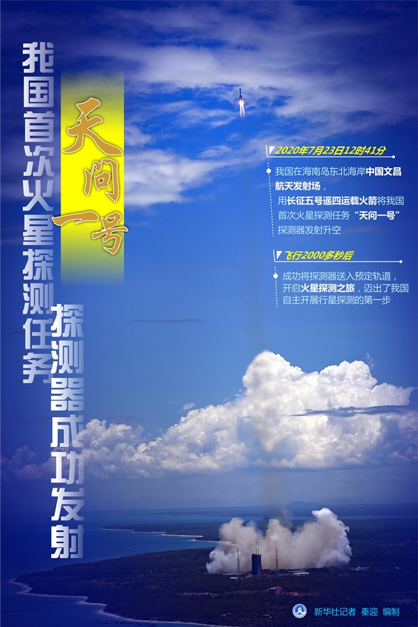 2020年7月23日12時41分,我國在海南島東北海岸中國文昌航天發(fā)射場,用長征五號遙四運載火箭將我國首次火星探測任務(wù)“天問一號”探測器發(fā)射升空,飛行2000多秒后,成功將探測器送入預(yù)定軌道,開啟火星探測之旅,邁出了我國自主開展行星探測的第一步。新華社記者 胡喆 攝