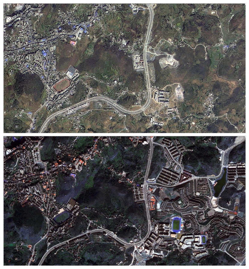拼版照片的上圖為2015年建設前的貴州省晴隆縣三寶街道阿妹戚托小鎮(zhèn)衛(wèi)星地圖截圖(以公路為界:右為阿妹戚托小鎮(zhèn),左為晴隆縣城);下圖為2019年建設完成后的阿妹戚托小鎮(zhèn)衛(wèi)星地圖截圖。新華社發(fā)(貴州省測繪資料檔案館供圖)