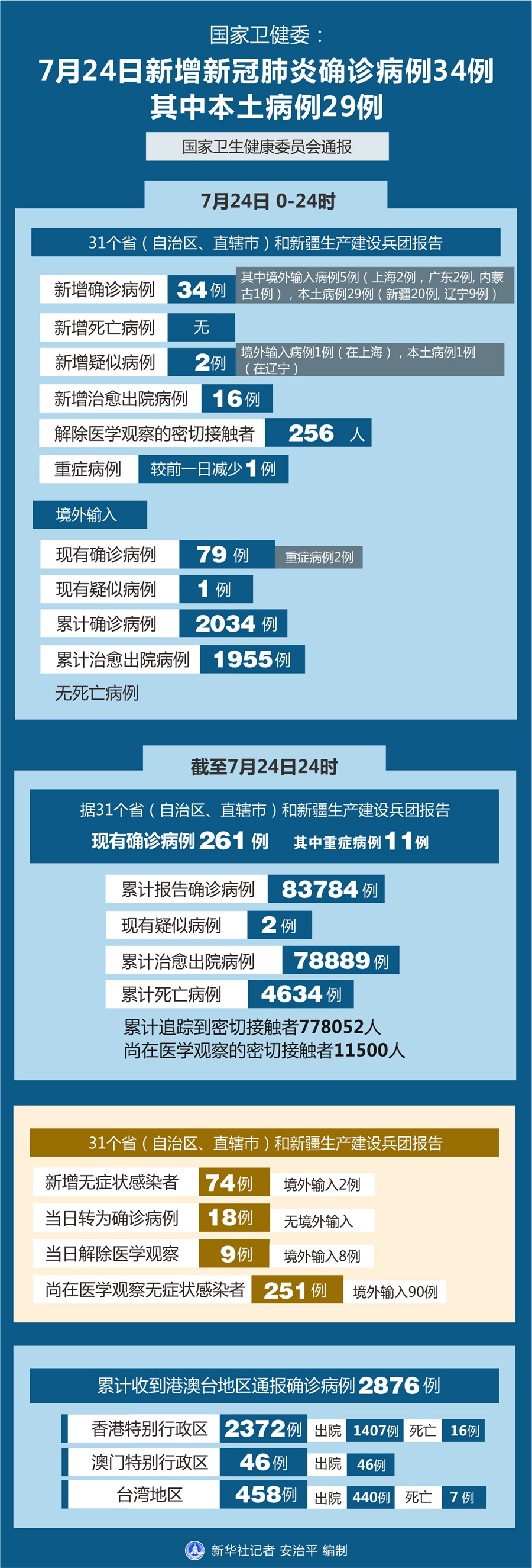 截至7月24日24時(shí),據(jù)31個(gè)?。ㄗ灾螀^(qū)、直轄市)和新疆生產(chǎn)建設(shè)兵團(tuán)報(bào)告,現(xiàn)有確診病例261例(其中重癥病例11例),累計(jì)治愈出院病例78889例,累計(jì)死亡病例4634例,累計(jì)報(bào)告確診病例83784例,現(xiàn)有疑似病例2例。累計(jì)追蹤到密切接觸者778052人,尚在醫(yī)學(xué)觀察的密切接觸者11500人。