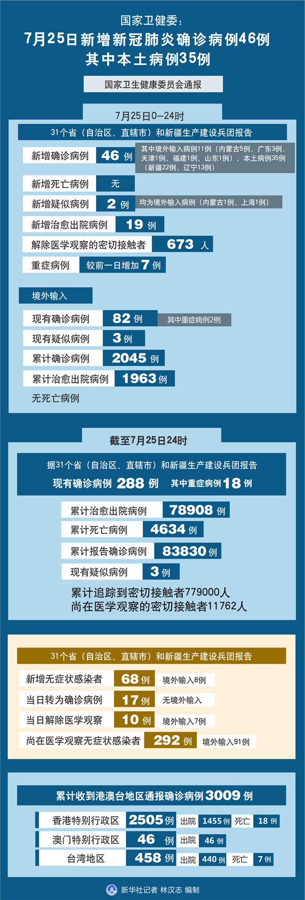 新華社北京7月26日電 國家衛(wèi)生健康委員會26日通報,7月25日0-24時,31個?。ㄗ灾螀^(qū)、直轄市)和新疆生產(chǎn)建設(shè)兵團(tuán)報告新增新冠肺炎確診病例46例,其中境外輸入病例11例(內(nèi)蒙古5例,廣東3例,天津1例,福建1例,山東1例),本土病例35例(新疆22例,遼寧13例);無新增死亡病例;新增疑似病例2例,均為境外輸入病例(內(nèi)蒙古1例,上海1例)。