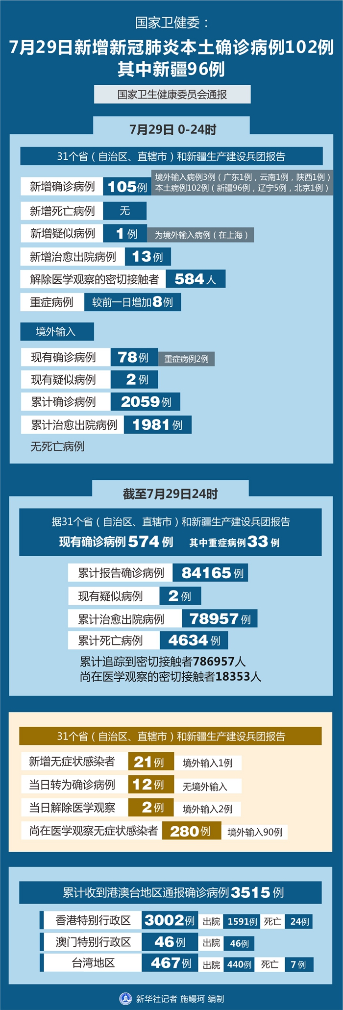 截至7月29日24時,據(jù)31個?。ㄗ灾螀^(qū)、直轄市)和新疆生產建設兵團報告,現(xiàn)有確診病例574例(其中重癥病例33例),累計治愈出院病例78957例,累計死亡病例4634例,累計報告確診病例84165例,現(xiàn)有疑似病例2例。累計追蹤到密切接觸者786957人,尚在醫(yī)學觀察的密切接觸者18353人。