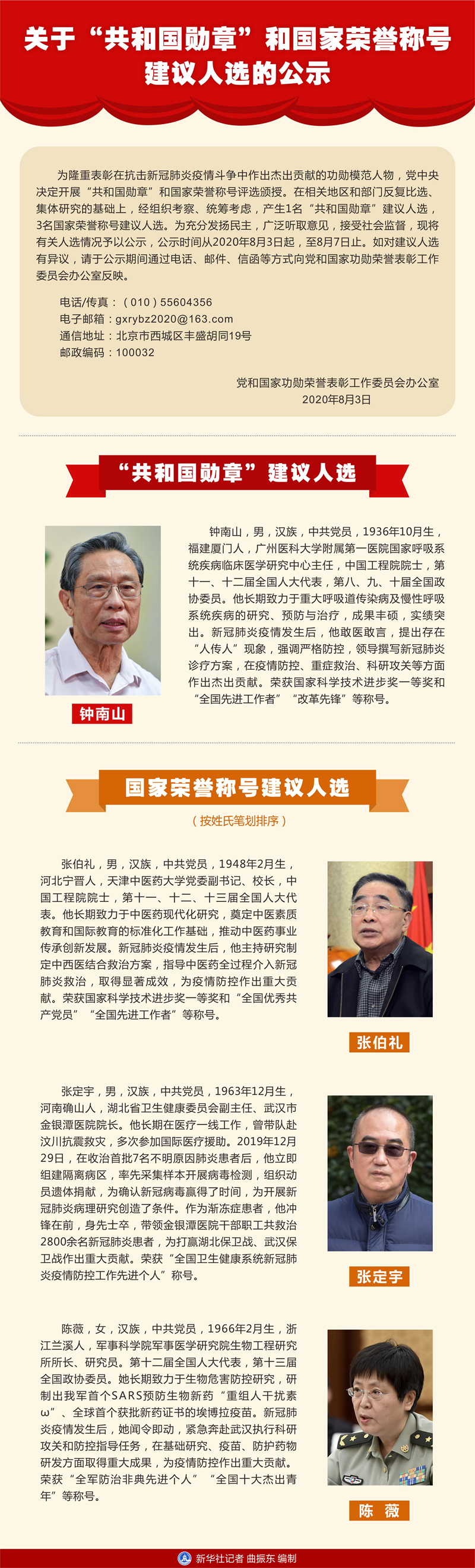 為隆重表彰在抗擊新冠肺炎疫情斗爭(zhēng)中作出杰出貢獻(xiàn)的功勛模范人物,黨中央決定開(kāi)展“共和國(guó)勛章”和國(guó)家榮譽(yù)稱號(hào)評(píng)選頒授。在相關(guān)地區(qū)和部門反復(fù)比選、集體研究的基礎(chǔ)上,經(jīng)組織考察、統(tǒng)籌考慮,產(chǎn)生1名“共和國(guó)勛章”建議人選,3名國(guó)家榮譽(yù)稱號(hào)建議人選。為充分發(fā)揚(yáng)民主,廣泛聽(tīng)取意見(jiàn),接受社會(huì)監(jiān)督,現(xiàn)將有關(guān)人選情況予以公示,公示時(shí)間從2020年8月3日起,至8月7日止。如對(duì)建議人選有異議,請(qǐng)于公示期間通過(guò)電話、郵件、信函等方式向黨和國(guó)家功勛榮譽(yù)表彰工作委員會(huì)辦公室反映。