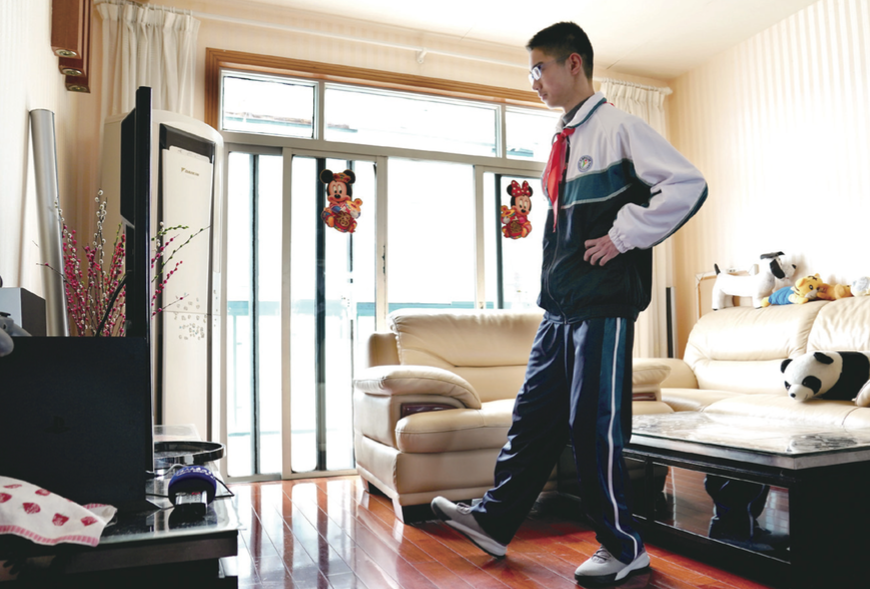 3月2日,上海市三門中學(xué)初二學(xué)生孫旭涵跟隨在線教育體育課老師學(xué)習(xí)居家健身操(劉穎 / 攝)
