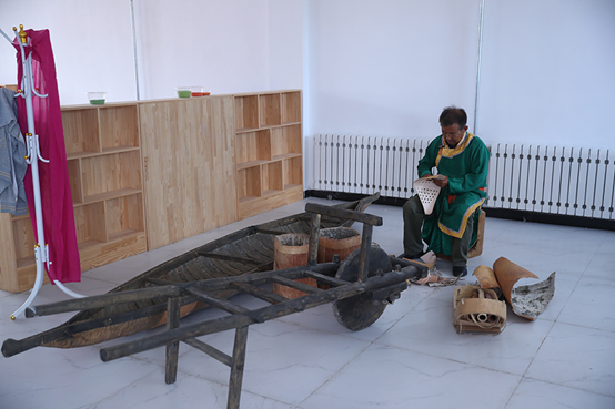 在獵民村手工藝工坊記者見到年輕時打過獵、扎過撮羅子(狩獵和游牧民族的一種圓錐形“房子”)的那春林,他正在用樺樹皮制作蟈蟈籠子。鄂溫克人會在籠子里放上蟈蟈,把蟈蟈當(dāng)作魚餌帶到阿倫河釣細(xì)鱗魚。他身旁的樺樹皮船、儲物筒、刀具配件都是用樺樹皮制作的。那春林說今年已接到一批展品訂單,預(yù)計(jì)可以收入4萬塊錢,家里流轉(zhuǎn)的土地還可以為他帶來3萬多元收入。