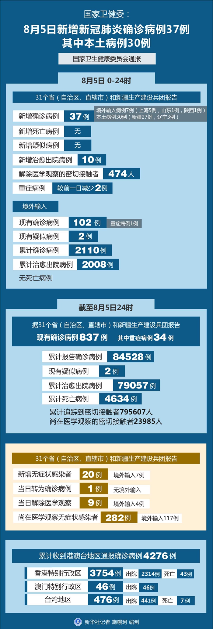 截至8月5日24時,據(jù)31個省(自治區(qū)、直轄市)和新疆生產(chǎn)建設(shè)兵團報告,現(xiàn)有確診病例837例(其中重癥病例34例),累計治愈出院病例79057例,累計死亡病例4634例,累計報告確診病例84528例,現(xiàn)有疑似病例2例。累計追蹤到密切接觸者795607人,尚在醫(yī)學(xué)觀察的密切接觸者23985人。