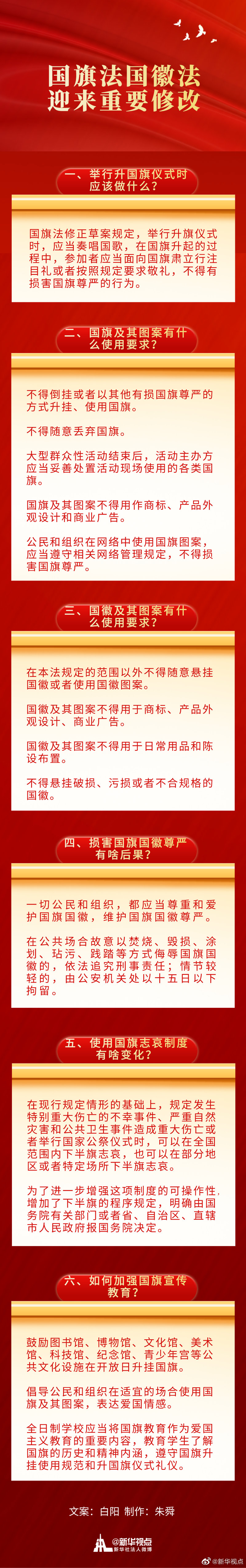 升國旗儀式上應(yīng)該做什么?參加大型群眾活動過后的國旗要怎么處理?損害國旗國徽尊嚴(yán)的行為有什么后果?8日,國旗法修正草案和國徽法修正草案提請全國人大常委會會議審議。戳大圖,了解兩法修正草案的重點(diǎn)↓↓ ????