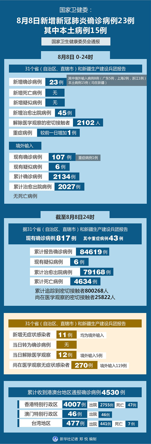 截至8月8日24時,據(jù)31個?。ㄗ灾螀^(qū)、直轄市)和新疆生產(chǎn)建設(shè)兵團(tuán)報告,現(xiàn)有確診病例817例(其中重癥病例43例),累計治愈出院病例79168例,累計死亡病例4634例,累計報告確診病例84619例,現(xiàn)有疑似病例6例。累計追蹤到密切接觸者800268人,尚在醫(yī)學(xué)觀察的密切接觸者25822人。