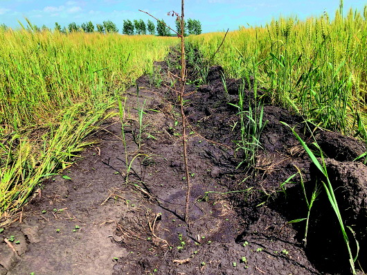 上圖:8月2日,陳巴爾虎旗特尼河林場大片麥田、油菜田,被鏟出一道道黑綠相間的“斑馬線”。中圖:8月2日,陳巴爾虎旗特尼河林場一處被毀的麥田。下圖:8月2日,陳巴爾虎旗特尼河林場一處被毀的麥田里,一些突擊種上的樹苗已經(jīng)枯萎?!”緢笥浾咄蹙笖z