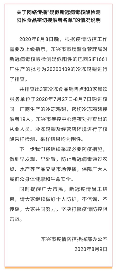 8月9日,記者從東興市疫情防控指揮部辦公室了解到, 8月8日晚,根據(jù)疫情防控工作需要及上級指示,東興市市場監(jiān)督管理局對新冠病毒核酸檢測疑似陽性的巴西SIF1661廠生產的批號為20200409的冷凍雞翅進行了排查,共排查出3家冷凍食品銷售點和3家餐飲服務單位于2020年7月27日—8月7日購進該同一廠商生產的冷凍雞翅,密切冷凍雞翅接觸者19人。東興市疾控中心連夜對排查出的從業(yè)人員、冷凍雞翅及經營店環(huán)境進行了核酸采樣檢測,采樣結果均為陰性。