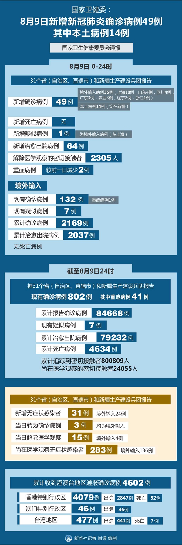 新華社北京8月10日電 國家衛(wèi)生健康委員會10日通報,8月9日0-24時,31個省(自治區(qū)、直轄市)和新疆生產(chǎn)建設(shè)兵團報告新增新冠肺炎確診病例49例,其中境外輸入病例35例(上海18例,山東4例,四川4例,廣東3例,陜西3例,遼寧2例,浙江1例),本土病例14例(均在新疆);無新增死亡病例;新增疑似病例1例,為境外輸入病例(在上海)。