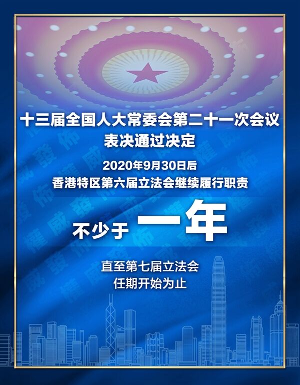 根據(jù)決定,2020年9月30日后,香港特別行政區(qū)第六屆立法會(huì)繼續(xù)履行職責(zé),不少于一年,直至香港特別行政區(qū)第七屆立法會(huì)任期開(kāi)始為止。香港特別行政區(qū)第七屆立法會(huì)依法產(chǎn)生后,任期仍為四年。