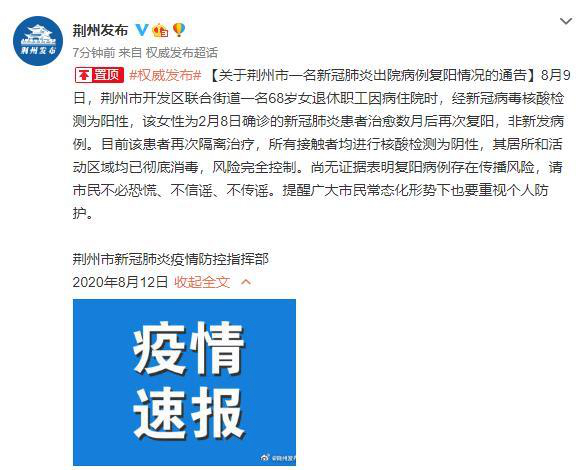 據(jù)湖北省荊州市新冠肺炎疫情防控指揮部12日通報,8月9日,荊州市開發(fā)區(qū)聯(lián)合街道一名68歲女退休職工因病住院時,經(jīng)新冠病毒核酸檢測為陽性,該女性為2月8日確診的新冠肺炎患者治愈數(shù)月后再次復(fù)陽,非新發(fā)病例。目前該患者再次隔離治療,所有接觸者均進行核酸檢測為陰性,其居所和活動區(qū)域均已徹底消毒,風險完全控制。尚無證據(jù)表明復(fù)陽病例存在傳播風險,請市民不必恐慌、不信謠、不傳謠。提醒廣大市民常態(tài)化形勢下也要重視個人防護。