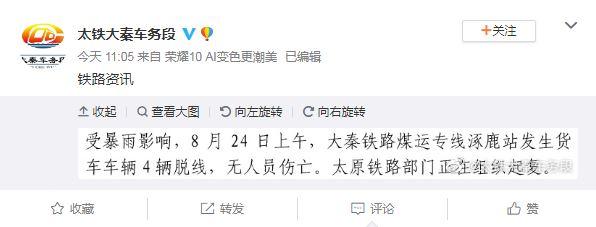 據(jù)大秦車務(wù)段官方微博消息,受暴雨影響,8月24日上午,大秦鐵路煤運(yùn)專線涿鹿站發(fā)生貨車車輛4輛脫線,無(wú)人員傷亡,太原鐵路部門(mén)正在組織修復(fù)。