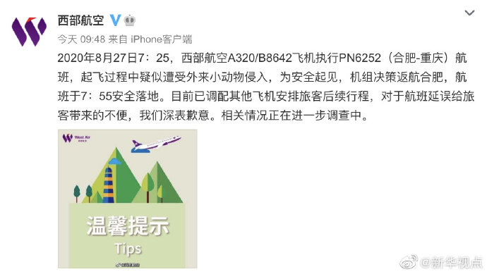 西部航空一合肥起飛客機(jī)疑遭小動物侵入 返航乘客已另搭機(jī)抵達(dá)重慶-新華網(wǎng)
