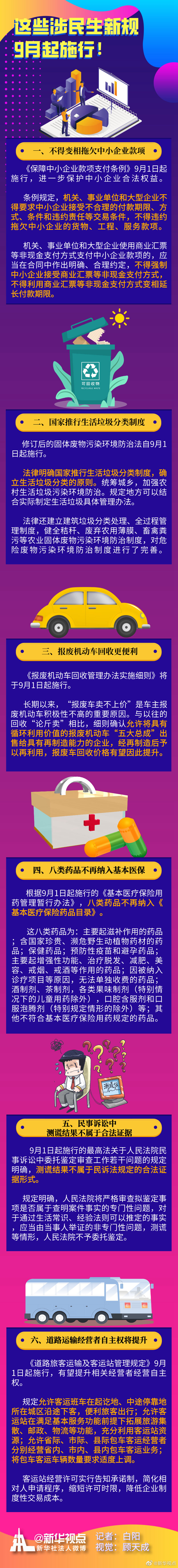 不得變相拖欠中小企業(yè)款項、國家推行生活垃圾分類制度、報廢機動車回收更加便利……即將到來的9月,又一批民生新規(guī)開始施行,給你我?guī)韺嵒荨?/p>