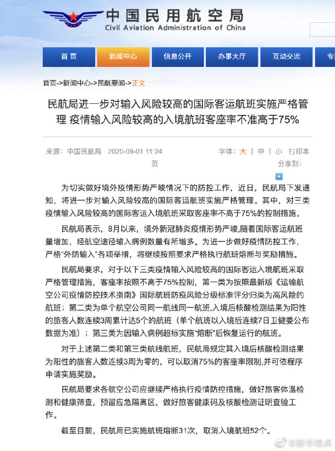 民航局表示,8月以來,境外新冠肺炎疫情形勢嚴(yán)峻,隨著國際客運(yùn)航班量增加,經(jīng)航空途徑輸入病例數(shù)量有所增多。為進(jìn)一步做好疫情防控工作,嚴(yán)格“外防輸入”各項舉措,將繼續(xù)按照要求嚴(yán)格執(zhí)行航班熔斷與獎勵措施。