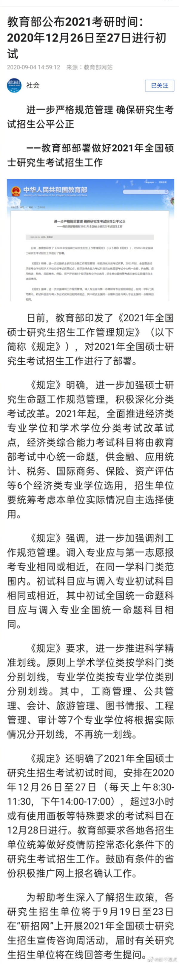其中,明確了2021年全國碩士研究生招生考試初試時間,安排在2020年12月26日至27日(每天上午8:30-11:30,下午14:00-17:00),超過3小時或有使用畫板等特殊要求的考試科目在12月28日進行。教育部要求各地各招生單位統(tǒng)籌做好疫情防控常態(tài)化條件下的研究生考試招生工作。鼓勵有條件的省份積極推廣網(wǎng)上報名確認工作。
