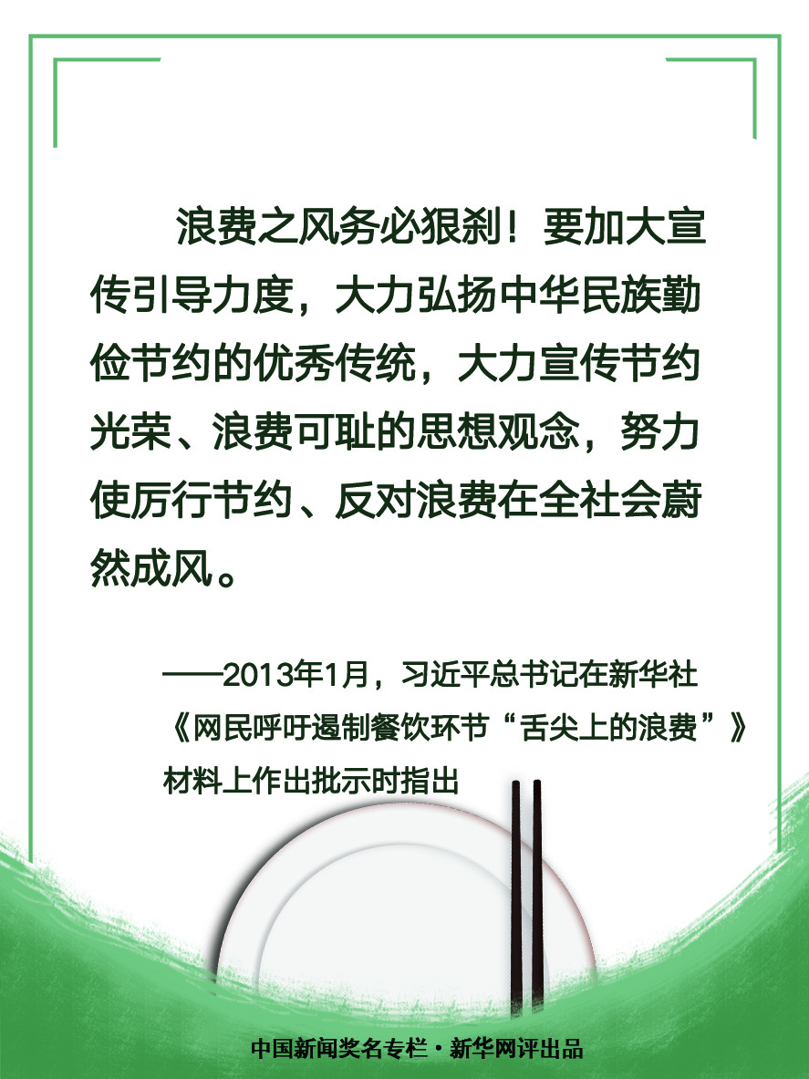民以食為天,食以儉養(yǎng)德。餐飲浪費現(xiàn)象存在著巨大危害,全社會必須深刻認識勤儉節(jié)約的重要性。當務之急,各地各部門、各餐飲機構(gòu)、每個人都要行動起來,采取加強立法、強化監(jiān)管、加強宣傳教育等舉措,從我做起,從小事做起,進一步營造勤儉節(jié)約之風。(文字:馬若虎 海報:張倩)