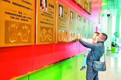 上下圖均為觀眾在中國科技館參觀“國家最高科學技術獎獲獎科學家手模墻”。中國科技館供圖