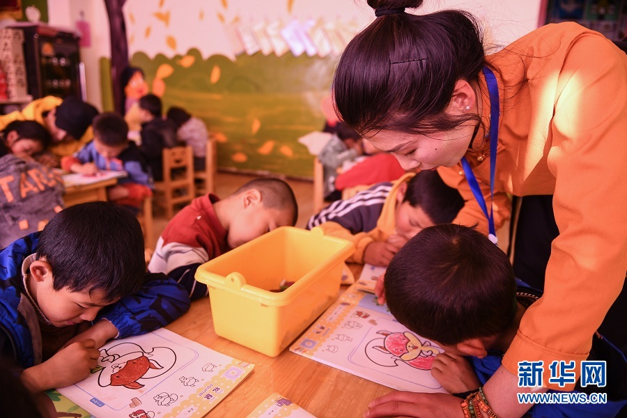 9月17日,青海省果洛藏族自治州瑪沁縣拉加鎮(zhèn)中心幼兒園的老師輔導孩子們上美術課。(新華網潘彬彬 攝)