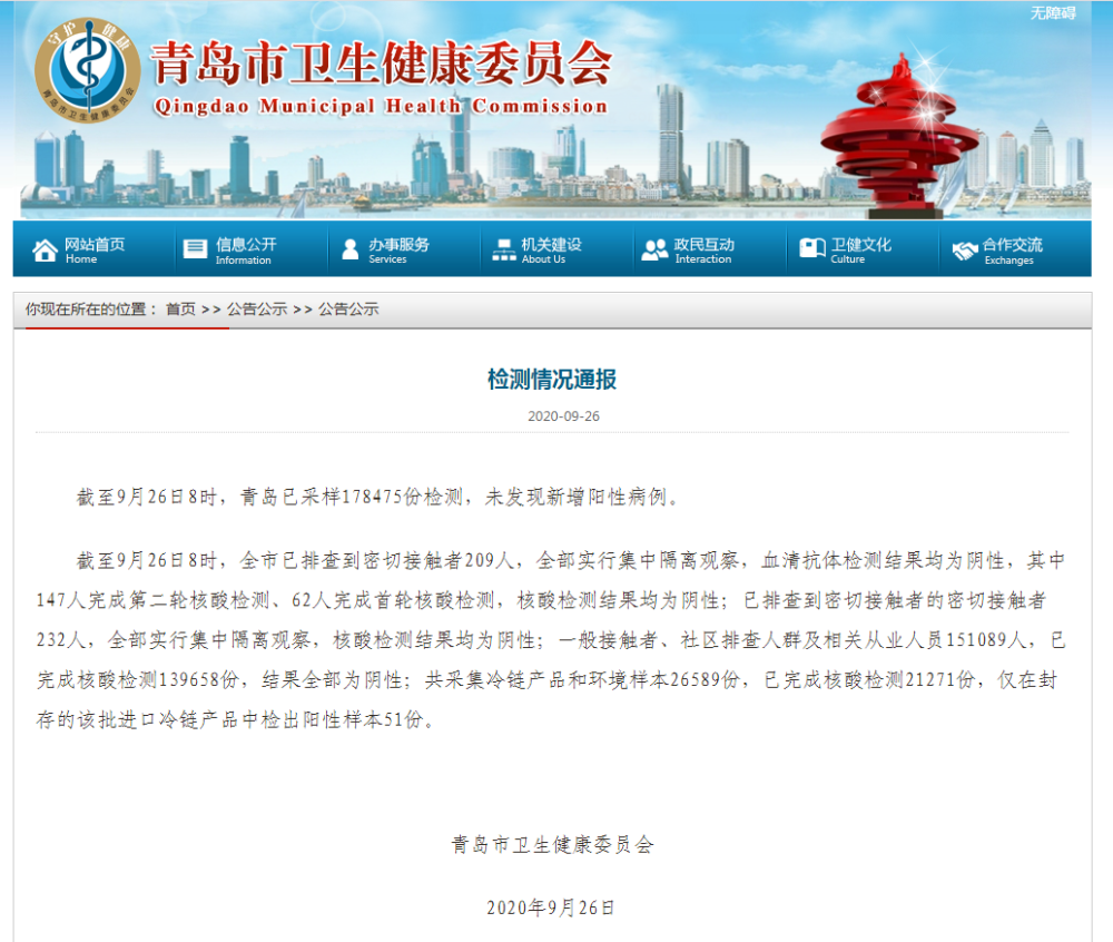截至9月26日8時(shí),青島已采樣178475份檢測,未發(fā)現(xiàn)新增陽性病例。