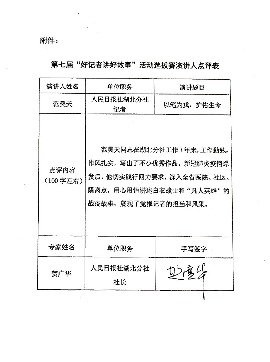 武漢爆發(fā)疫情以來,湖北分社“90后”記者范昊天同志就一直奮戰(zhàn)在疫情防控一線,深入全省醫(yī)院、社區(qū)、隔離點采訪,參與推出《武漢 分秒必爭抗疫情》《武漢保衛(wèi)戰(zhàn)打響關(guān)鍵之役》《八古墩社區(qū)的這場保衛(wèi)戰(zhàn)》《黃岡戰(zhàn)“疫”,防控更嚴更實更細》等數(shù)十篇實地探訪的獨家深度報道,還采寫呼吁各級干部下沉社區(qū)等多篇內(nèi)參,推動解決基層防控難題。疫情期間,他和同事們不斷上報“四類人員”信息,幫助大量患者得到妥善收治。2020年9月,隨分社榮獲“全國抗擊新冠肺炎疫情先進集體”,本人獲得人民日報社抗疫先進個人、武漢市抗疫先進個人等榮譽。