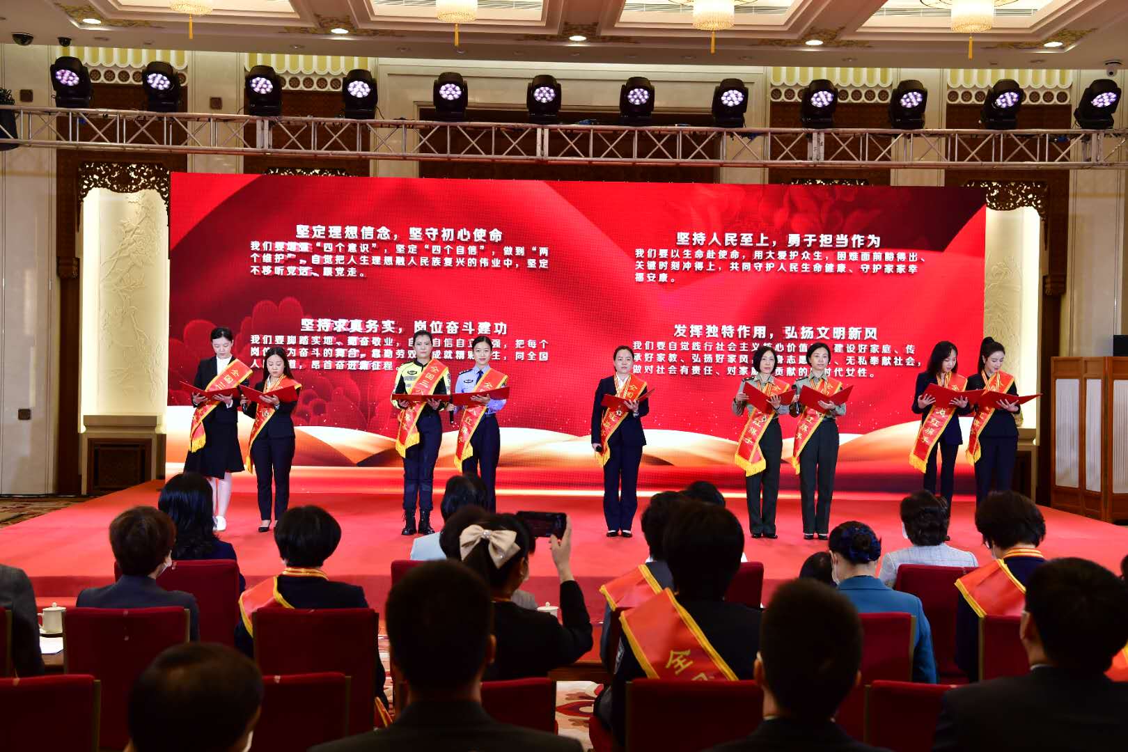 “堅定理想信念,堅守初心使命;堅持人民至上,勇于擔(dān)當(dāng)作為;堅持求真務(wù)實,崗位奮斗建功;發(fā)揮獨特作用,弘揚文明新風(fēng)?!惫鹦∶谩⒑3?、肖利、范怡婷、周艷、陶源、薇婭、劉仙、謝小玉代表受表彰的抗疫全國三八紅旗手向全國姐妹們發(fā)出倡議,更加緊密地團(tuán)結(jié)在以習(xí)近平同志為核心的黨中央周圍,弘揚偉大抗疫精神,爭做新時代最美巾幗奮斗者,努力創(chuàng)造無愧于時代、無愧于人民、無愧于歷史的業(yè)績,為建設(shè)社會主義現(xiàn)代化強(qiáng)國、實現(xiàn)中華民族偉大復(fù)興書寫嶄新的巾幗榮光。