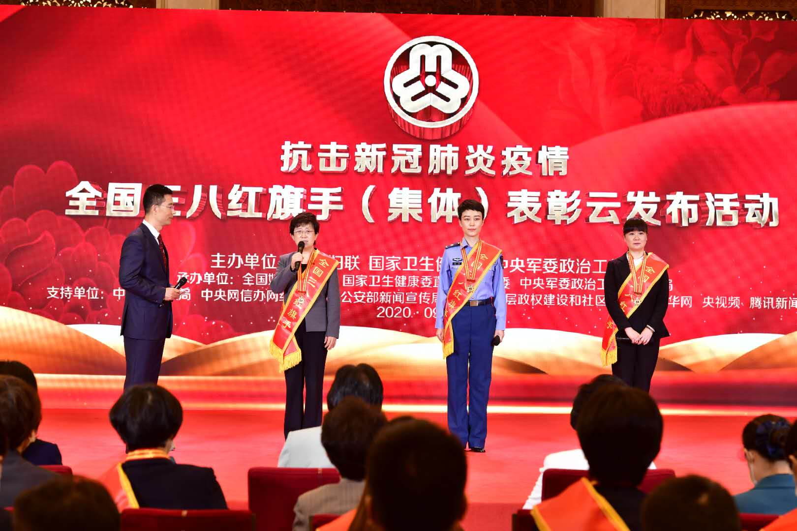 活動開始,全場肅立,向新冠肺炎疫情犧牲烈士和逝世同胞默哀?,F(xiàn)場還通過短片致敬犧牲的抗疫全國三八紅旗手英模。全國婦聯(lián)、國家衛(wèi)生健康委、中央軍委政治工作部聯(lián)合表彰鮑琳琳等500名同志和湖北省武漢市金銀潭醫(yī)院功能科等100個集體,均為敬佑生命、救死扶傷、甘于奉獻(xiàn)、大愛無疆的醫(yī)務(wù)人員;全國婦聯(lián)表彰顏葵等300名同志和北京市豐臺區(qū)新村街道風(fēng)格與林社區(qū)居委會等100個集體,都是在群防群治、聯(lián)防聯(lián)控中挺身而出的各行各業(yè)優(yōu)秀女性。