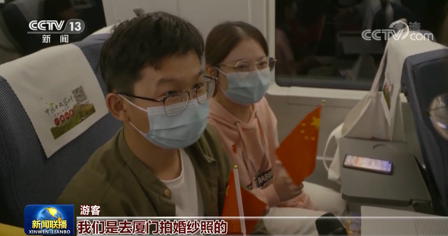 游客:我們是去廈門拍婚紗照的,沿邊的風(fēng)景都很好看,我們剛才把五星紅旗跟藍(lán)天還比著,拍了個照片,每天都讓我們自己有種愛上祖國新的那種感動。