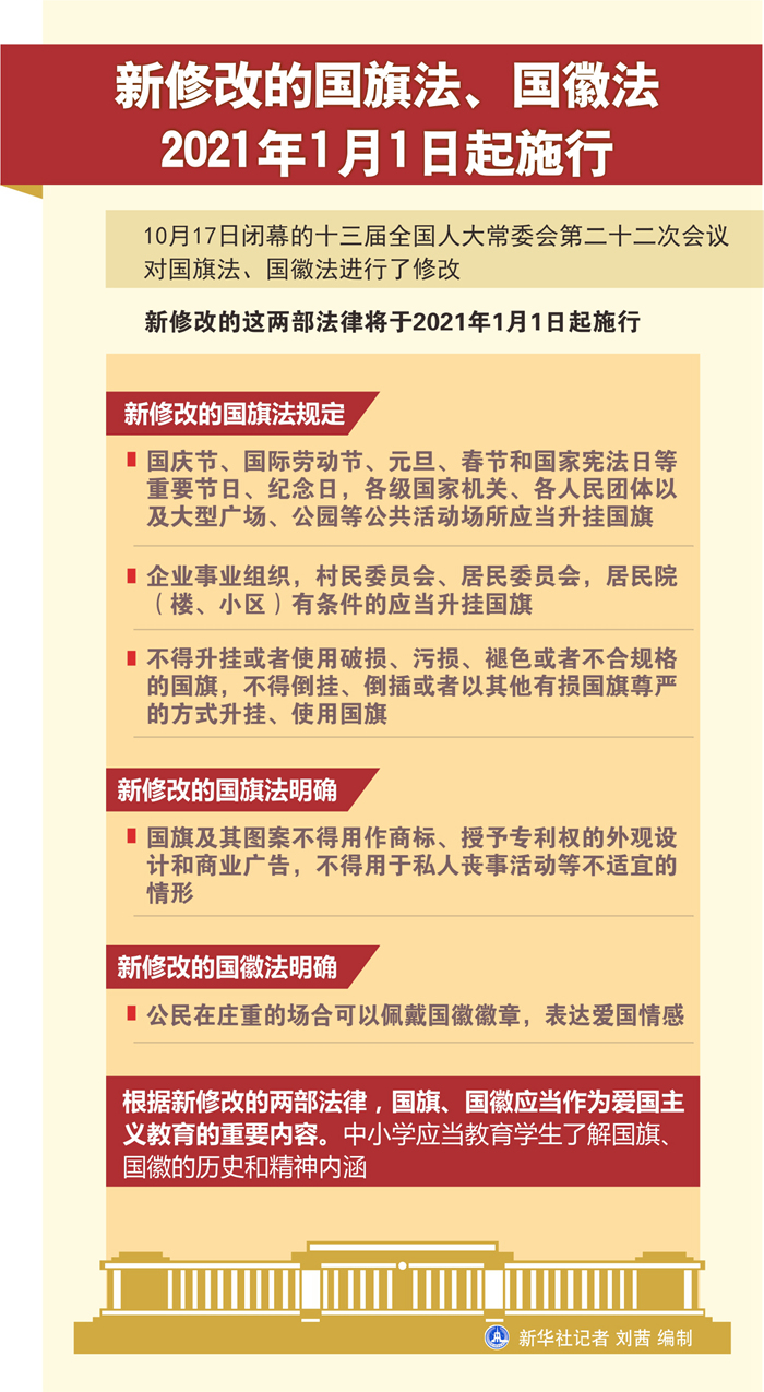 新華社北京10月17日電(記者丁小溪)17日閉幕的十三屆全國人大常委會(huì)第二十二次會(huì)議對國旗法、國徽法進(jìn)行了修改。新修改的這兩部法律將于2021年1月1日起施行。
