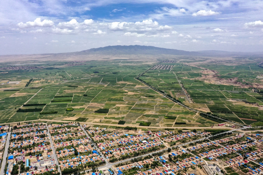 這是6月23日拍攝的位于羅山腳下的寧夏吳忠市紅寺堡區(qū)一角(無(wú)人機(jī)照片)。新華社記者 馮開華 攝