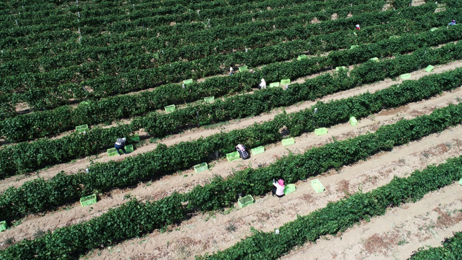 在寧夏銀川市永寧縣閩寧鎮(zhèn)的立蘭酒莊釀酒葡萄種植基地,農(nóng)戶在田間采摘葡萄(2019年9月3日攝,無(wú)人機(jī)照片)。新華社記者 王鵬 攝