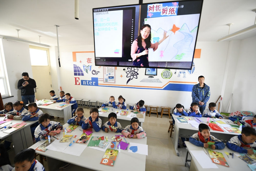 移民區(qū)的孩子在中衛(wèi)市中寧縣寬口井中石油希望學(xué)?!霸诰€課堂”上課(2018年3月27日攝)。新華社記者 王鵬 攝