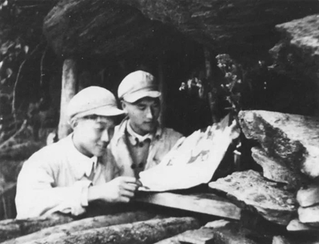 1951年抗美援朝第5次戰(zhàn)役期間,新華社記者李耐因隨軍(26軍)采訪,經常露營,寫稿子也常是在樹下、路邊或臨時搭起的棚子里。這是記者李耐因(右)在臨時搭起的防空棚下,向軍隊參謀人員請教戰(zhàn)況。