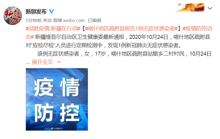 新疆維吾爾自治區(qū)衛(wèi)生健康委最新通報,2020年10月24日,喀什地區(qū)疏附縣對“應(yīng)檢盡檢”人員進(jìn)行定期檢測中,發(fā)現(xiàn)1例新冠肺炎無癥狀感染者。