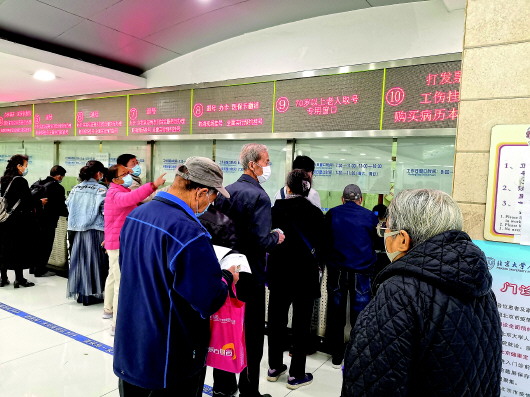 ▲10月10日清晨7點多,北京大學人民醫(yī)院門診樓唯一的老年窗口,老年人在排隊等待掛號。 本報記者尹平平攝