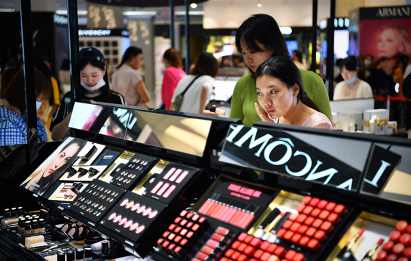 年輕人在免稅店挑選化妝品 郭程 攝