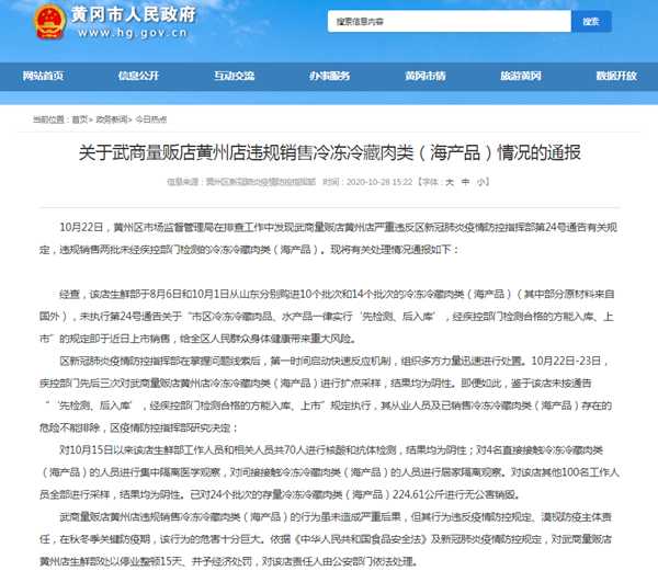 10月22日,黃州區(qū)市場監(jiān)督管理局在排查工作中發(fā)現(xiàn)武商量販店黃州店嚴重違反區(qū)新冠肺炎疫情防控指揮部第24號通告有關規(guī)定,違規(guī)銷售兩批未經(jīng)疾控部門檢測的冷凍冷藏肉類(海產(chǎn)品)?,F(xiàn)將有關處理情況通報如下: