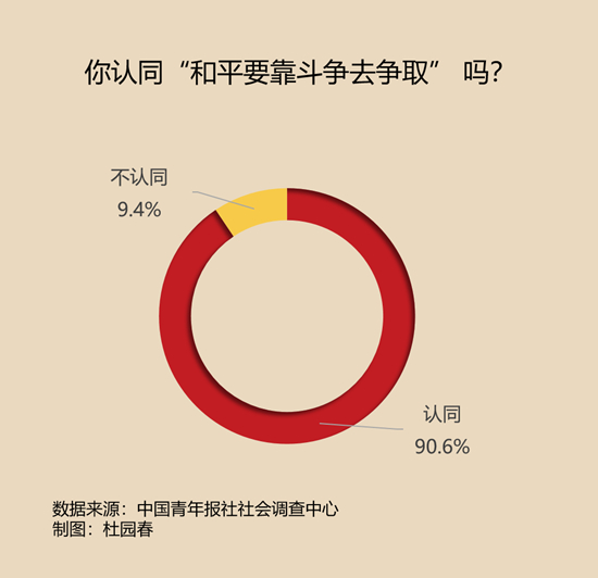 調(diào)查中,有90.6%的受訪者認同“和平要靠斗爭去爭取”這句話。