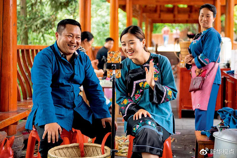5月15日,十八洞村第三任扶貧工作隊隊長麻輝煌(左)與返鄉(xiāng)大學(xué)生施林嬌一起通過網(wǎng)絡(luò)直播推銷土特產(chǎn) 新華社記者陳思汗 攝