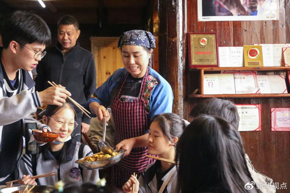 10月26日,十八洞村村民施進蘭的妻子龍齊英(中)在農(nóng)家樂給游客們上菜(受訪者供圖) 新華社發(fā)