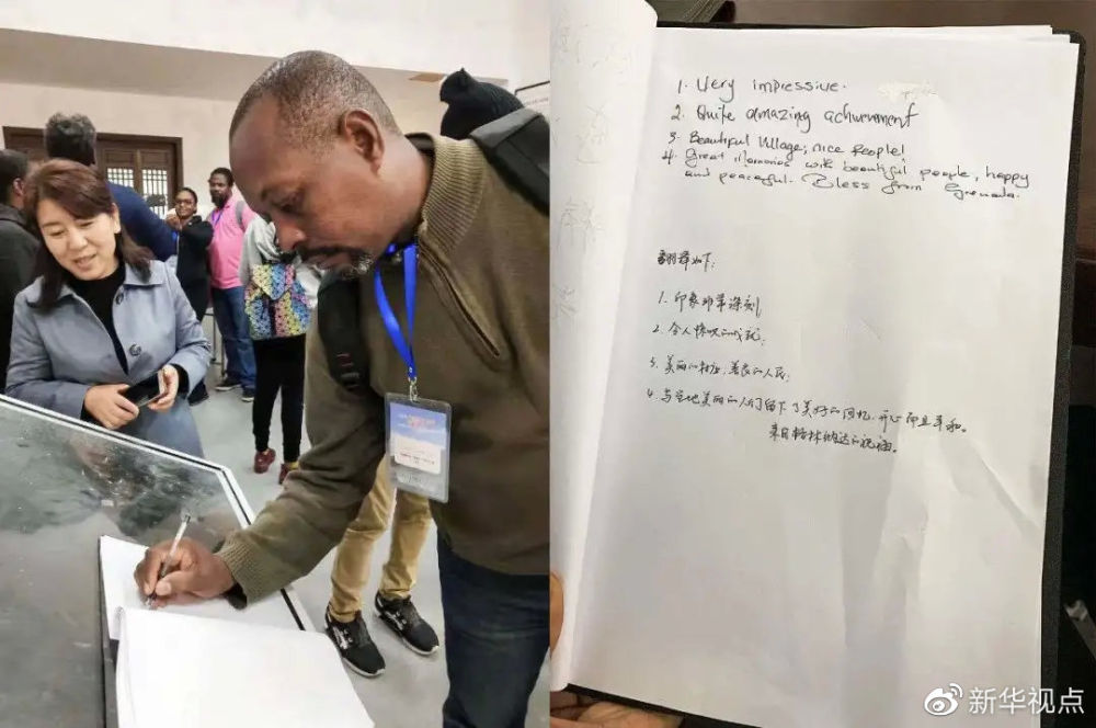 2019年10月28日,記者在十八洞村遇到了格林納達減貧戰(zhàn)略研修班的學(xué)員們,他們大多是來自格林納達農(nóng)業(yè)部的官員。參觀完后,他們派出代表在十八洞村留言簿上寫下留言 新華社記者張玉潔 攝