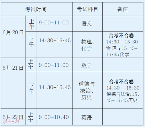 答:《廣州市教育局關于進一步深化高中階段學校考試招生制度改革的實施意見》(穗教規(guī)字〔2018〕8號)規(guī)定,物理和化學、道德與法治和歷史科目考試實行“合考不合卷”。合考的兩個學科安排在同一場次依次進行考試,試卷分開收發(fā),兩科考試中間安排15分鐘時間收發(fā)試卷,期間考生原則上不得離開考場。