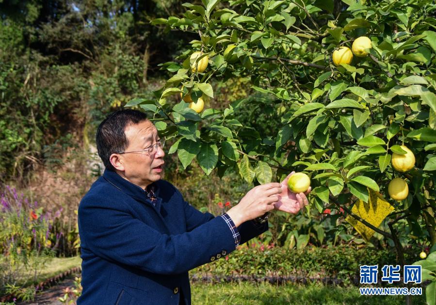 在四川省資陽市安岳縣寶森檸檬小鎮(zhèn)世界檸檬品種博覽園,安岳縣檸檬產業(yè)發(fā)展中心主任田再澤在查看檸檬的長勢情況(11月11日攝)。新華社記者 周相吉 攝