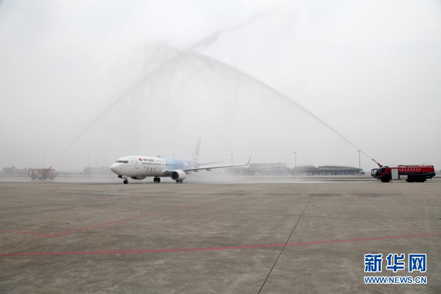 9月5日,中國(guó)國(guó)際航空公司冬奧主題彩繪飛機(jī)“冬奧冰雪號(hào)”在成都雙流機(jī)場(chǎng)正式亮相并參加“過(guò)水門”儀式。新華社發(fā)(中國(guó)國(guó)際航空公司西南分公司供圖)