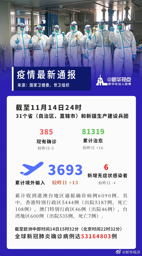 截至11月14日24時,據(jù)31個省(自治區(qū)、直轄市)和新疆生產建設兵團報告,現(xiàn)有確診病例385例(其中重癥病例4例),累計治愈出院病例81319例,累計死亡病例4634例,累計報告確診病例86338例,現(xiàn)有疑似病例2例。累計追蹤到密切接觸者873191人,尚在醫(yī)學觀察的密切接觸者15032人。
