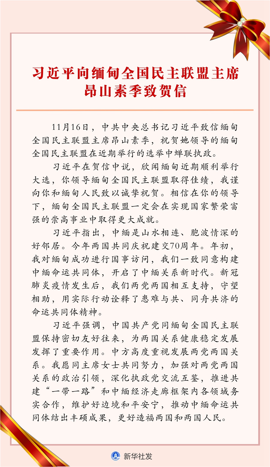 新華社北京11月17日電 11月16日,中共中央總書記習(xí)近平致信緬甸全國民主聯(lián)盟主席昂山素季,祝賀她領(lǐng)導(dǎo)的緬甸全國民主聯(lián)盟在近期舉行的選舉中蟬聯(lián)執(zhí)政。