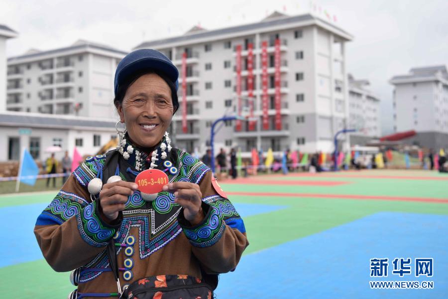 在布拖縣依撒社區(qū)安置點(diǎn)抽簽分房現(xiàn)場(chǎng),56歲的阿比么日扎展示自己抽中的新家房號(hào)(6月21日攝)。新華社記者 胥冰潔 攝